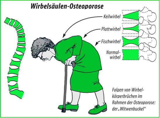 Gesunde Knochen sind den Belastungen des Alltags gewachsen. Erst wenn die Zug- oder Druckfestigkeit des äußeren Knochengewebes durch Gewalteinwirkungen (Sturz, Unfall etc.) ü-berschritten wird, kommt es zur Fraktur. Von Frakturen spricht man auch, wenn z. B. durch Osteoporose geschädigte Wirbelkörper brechen und an Höhe verlieren. Sie bestehen aus schwammartigen, fein vernetzten Knochenbälkchen, deren Abbau zu einen Zusammensinken führt. Die Folge: Der Patient entwickelt einen Rundrücken und schrumpft. Eine Abnahme der Körpergröße von mehr vier Zentimetern ist osteoporoseverdächtig. Der Rundrücken (Kyphosierung) (auch „Witwenbuckel“ genannt) ist der sichtbare Beweis für meist mehrere Wirbelbrüche, die zu Verformungen der Wirbelsäule führen.